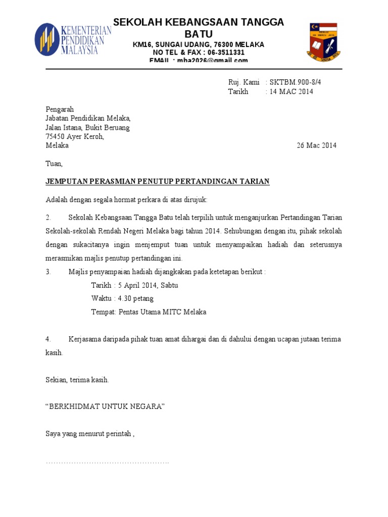 Contoh Surat Jemputan Sebagai Perasmi. ٢٦ ذو الحجة ١٤٤٢ هـ. 15 April 2013 Surat Aduan Kepada Datuk Bandar Kuala Lumpur Berkenaan Percubaan Untuk Mencabut.